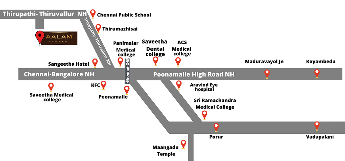 Welcome to AALAM Senior Heaven – a thoughtfully curated retirement community designed for comfort, dignity, and peace of mind. Located with easy access to Outer Ring Road, Poonamallee, major hospitals, and spiritual centers, AALAM offers the perfect blend of accessibility and serenity.